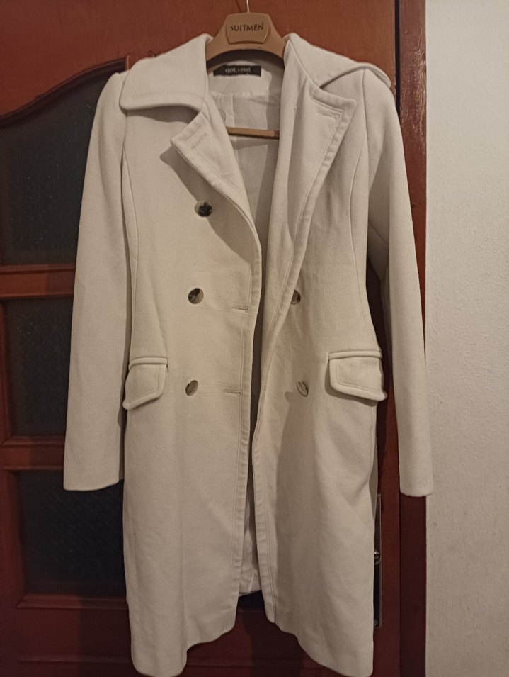 Parlak düğmeli, beyaz kadın kaban. Kumaşı yumuşaktır. Resmi durur. Hiçbir kusuru yoktur. Tarzıma uyduramadığım için satıyorum. Kaliteli markadır