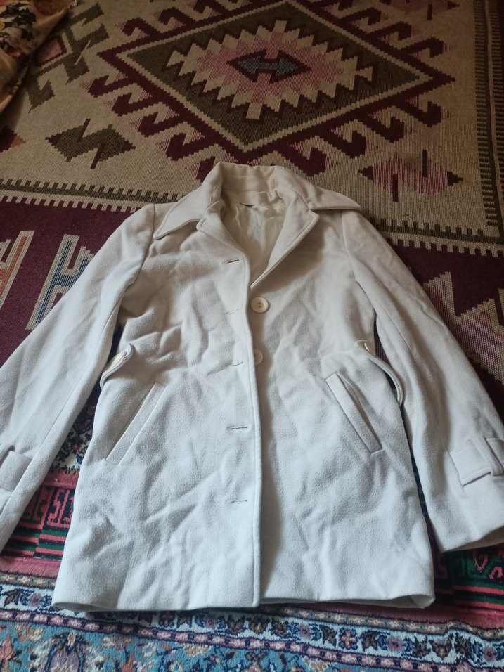 Düğmeli, yakalı beyaz kadın kaban, normal kesim ve uzun kolludur. Yumuşak ve sıcak kumaştan yapılmıştır, günlük kullanım için uygundur.