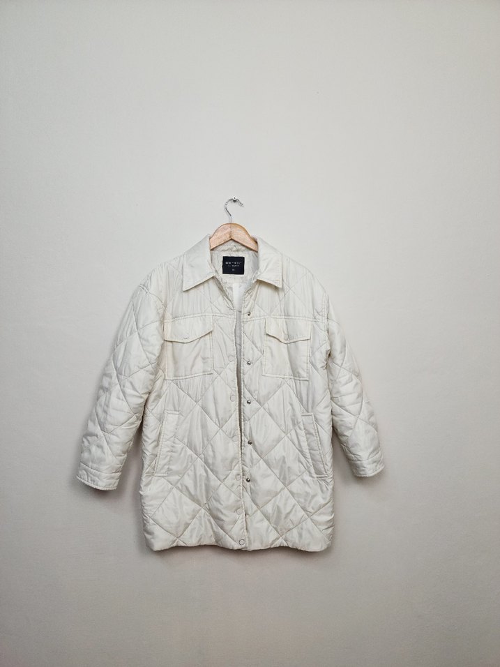 Düğmeli ön, uzun kollu ve kesik yakalı beyaz kapitone ceket. Bol kesim ve midi boy, günlük sokak stiline uygun minimal tasarım.
