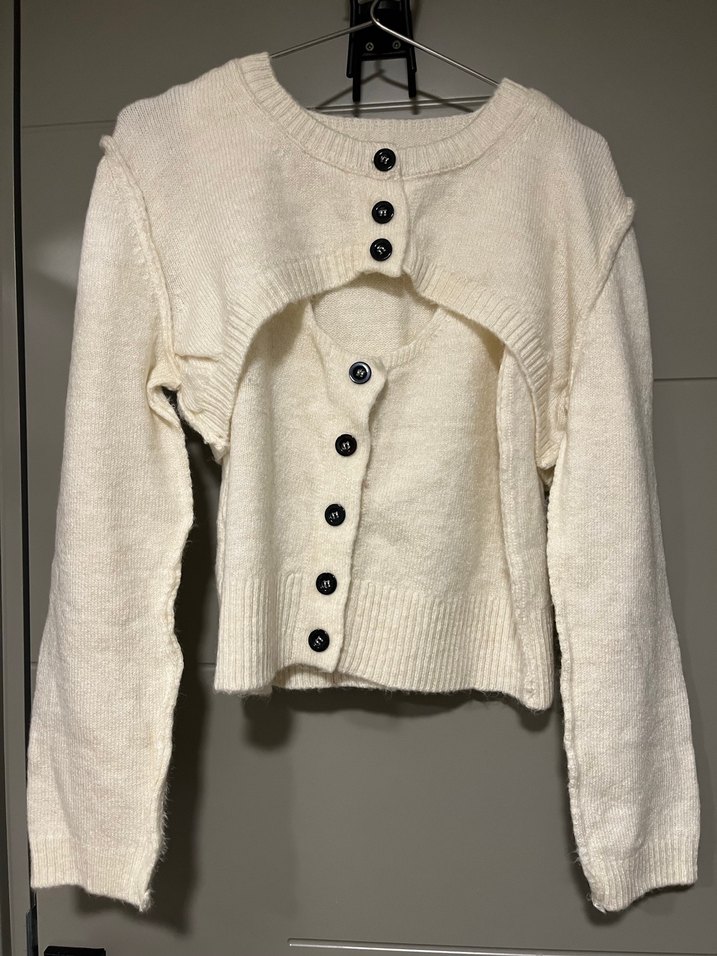 Krem renkli, İki parçadan oluşmaktadır ayrı ayrı kullanılabilir, düğmeli, uzun kollu. Rahat ve sade tarzda, günlük kullanıma uygun. Düğmelerin yanında kırmızı bir ip hatası var son görsele ekledim çok belli olmuyor.