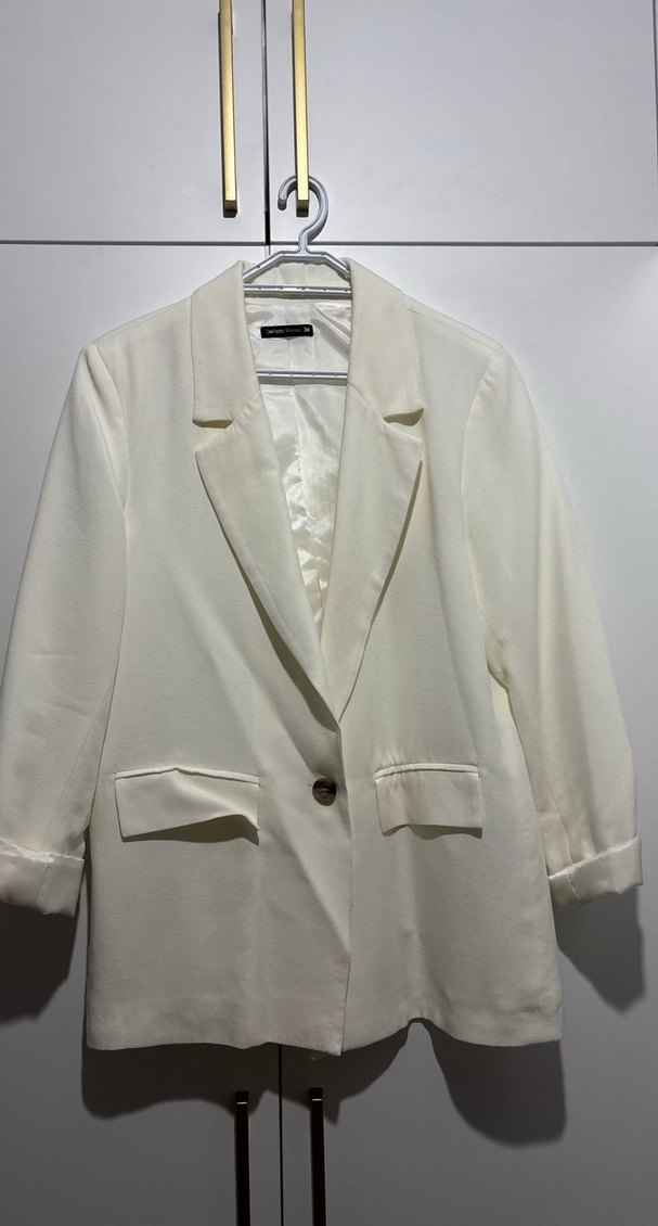 Düğmeli, keten kumaştan beyaz blazer ceket. Notch yaka ve uzun kollu, normal boyda, ofis ve günlük kullanım için uygun.