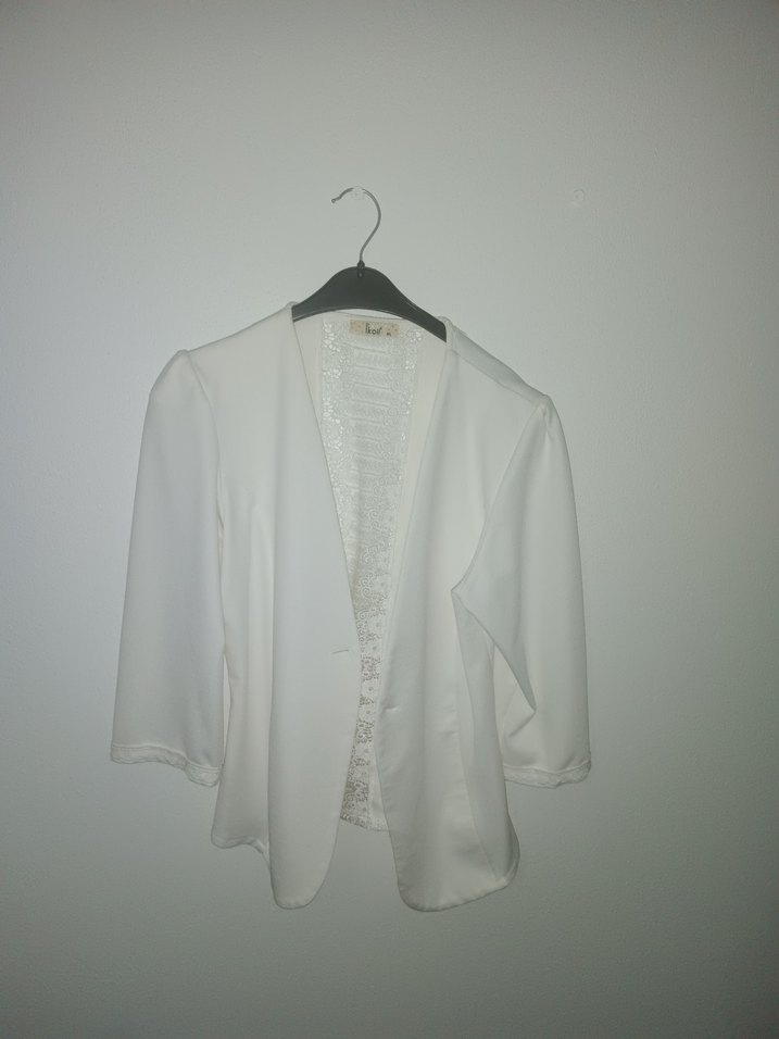Düğmeli detaylara sahip beyaz keten blazer, klasik ofis stiline uygun normal uzunlukta, uzun kollu ve regular fit kesimdedir.