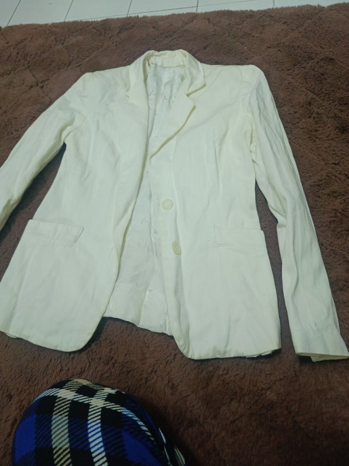 Beyaz keten kumaştan yapılmış, düğmeli, normal uzunlukta ve regular fit kadın blazer ceket. Ofis kullanımı için uygundur.
