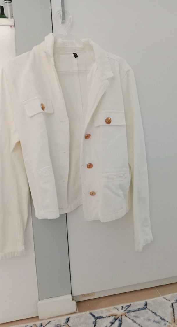 Düğmeli, beyaz keten kadın ceket. Normal boy, uzun kollu ve sade tasarımıyla minimalist ve trend bir görünüm sunar.