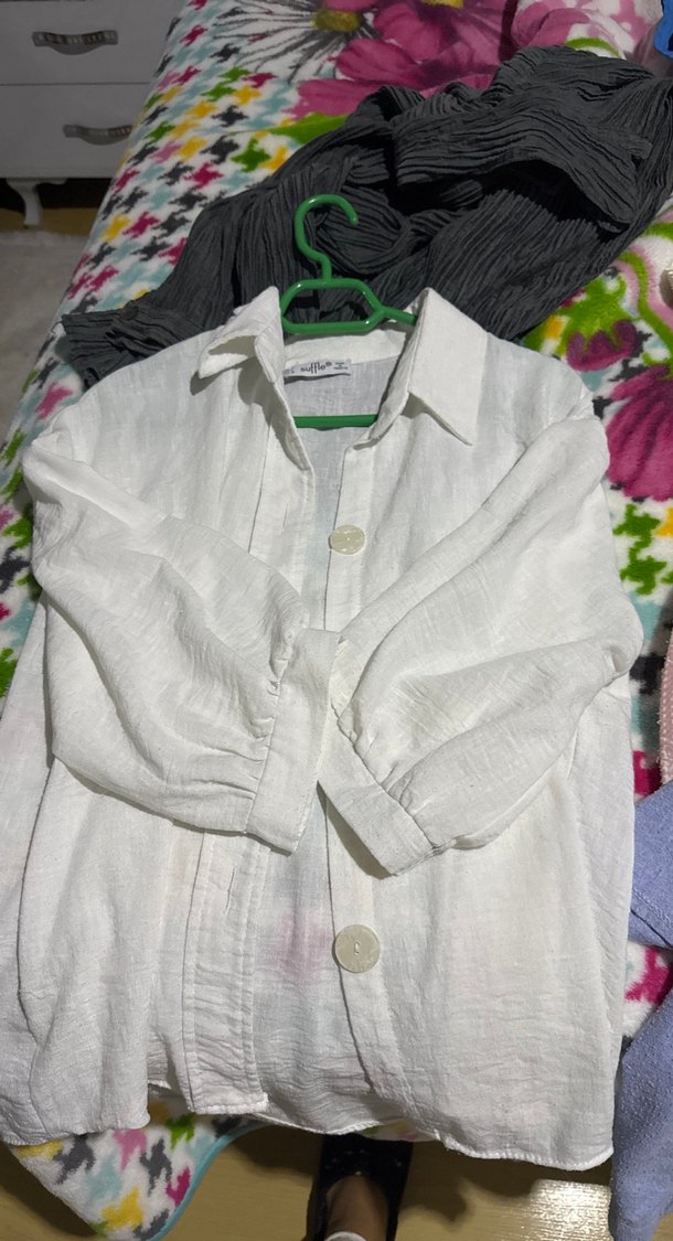 Beyaz kadın keten gömlek, uzun kollu ve yakalıdır. Düğmeli ön kısmı ve rahat kesimiyle günlük kullanım için uygundur.