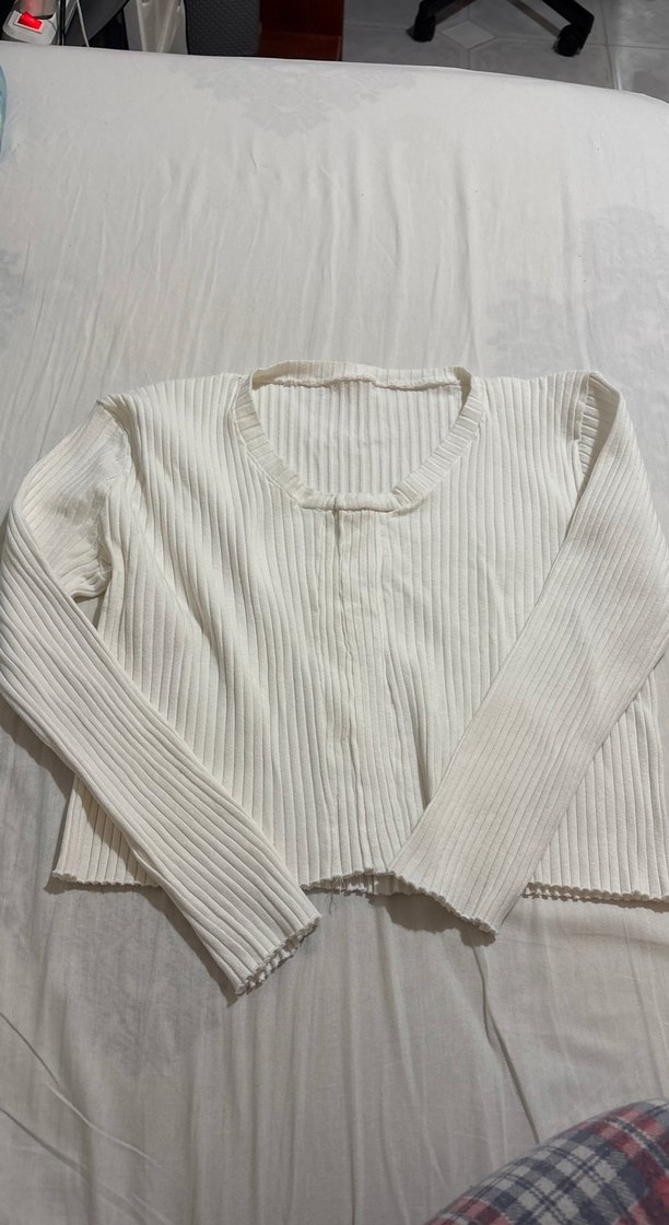 Uzun kollu, düğmeli beyaz keten kazak. Salaş kesim ve tek renk, günlük kullanıma uygun sade tasarım.