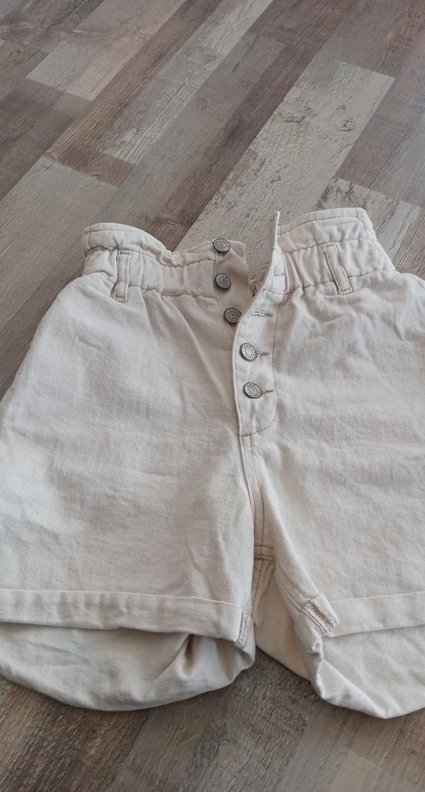 Düğmeli beyaz keten mini şort, bol kesimi ve rahat bohem tarzıyla günlük kullanıma uygundur.