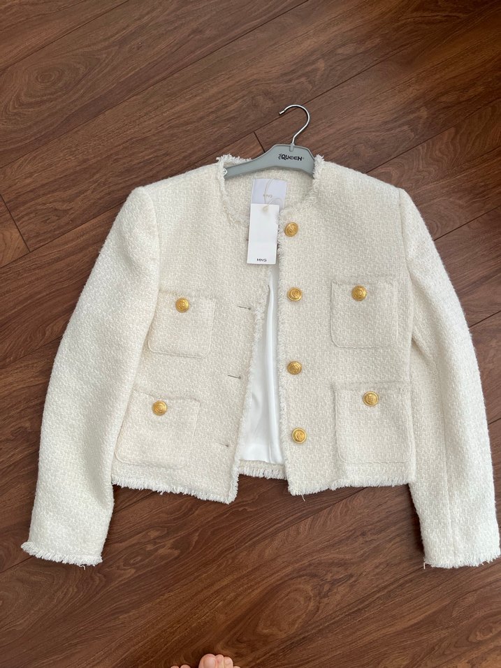 Bu beyaz yün ceket, altın düğmeli önü, kısa boyu ve uzun kollara sahiptir. Düzenli kesim ve kesik yaka stiliyle günlük kullanıma uygundur, Paris sokak modası tarzını yansıtır.