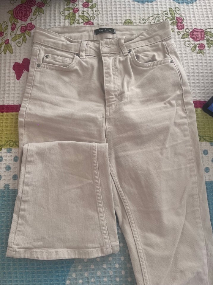 Pamuklu, düğmeli ve midi boy beyaz kot pantolon. Rahat kesimiyle günlük ve sokak stiline uygundur.