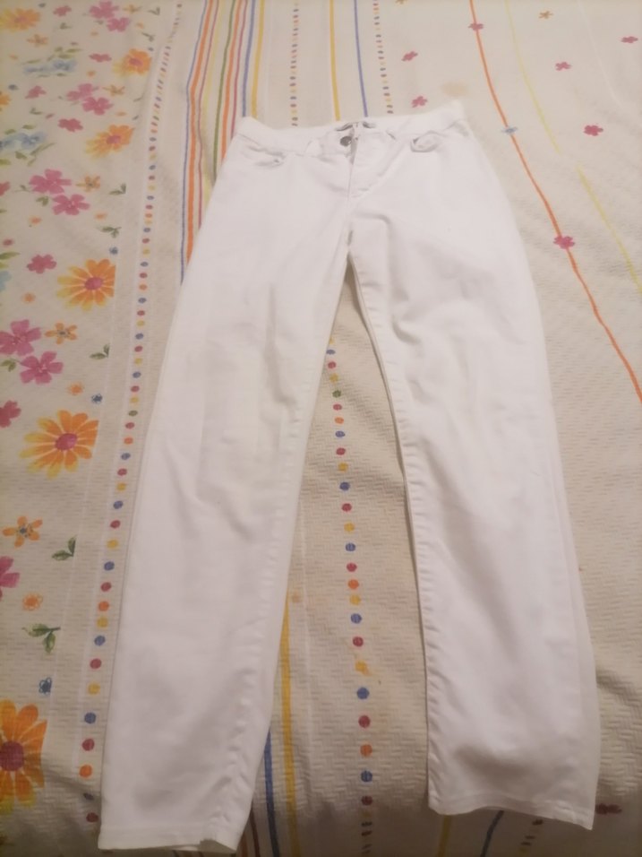 Beyaz pamuk kumaştan, düğmeli ve normal boyda, rahat kesimli kadın pantolonu. Günlük sokak stili için uygundur.