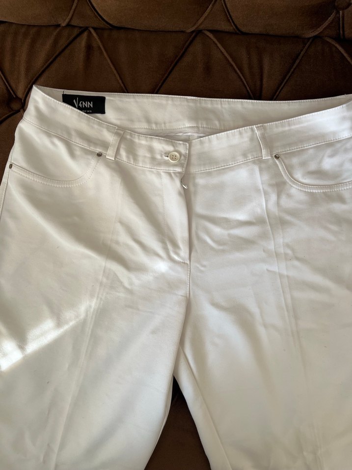 Düğmeli, beyaz kadın kumaş pantolon, normal midi boy ve regular kesim. İpeksi kumaştan, parlak ve sade, ofis için uygun.