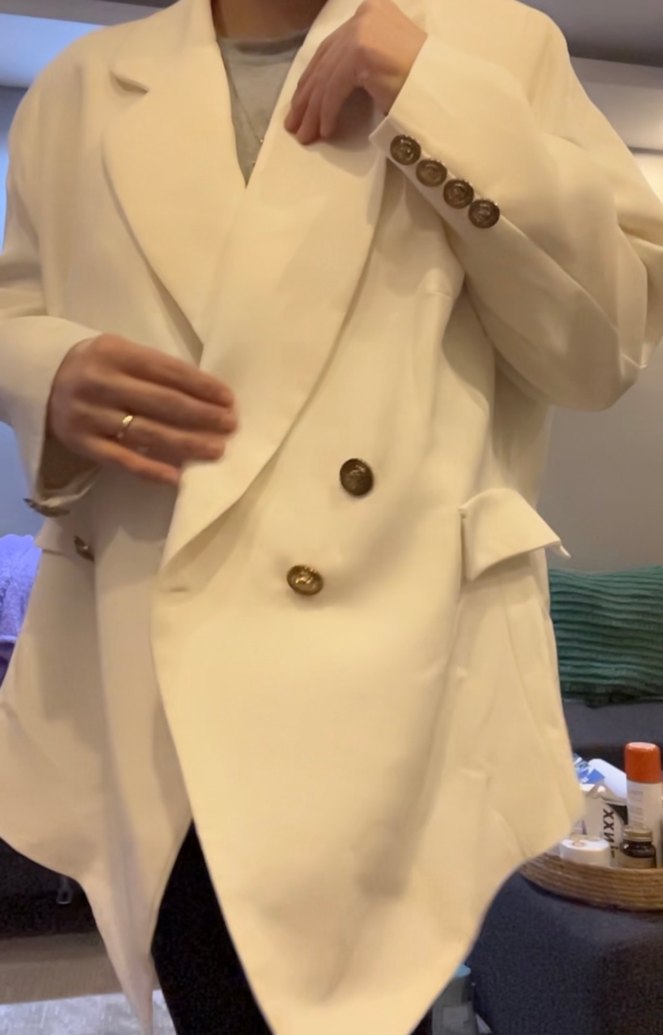 Düğmeli beyaz kadın blazer, kesik yaka ve uzun kollu. Orta boy, regular fit ve ipek gibi dokulu, ofis ve sokak stiline uygun. ✨