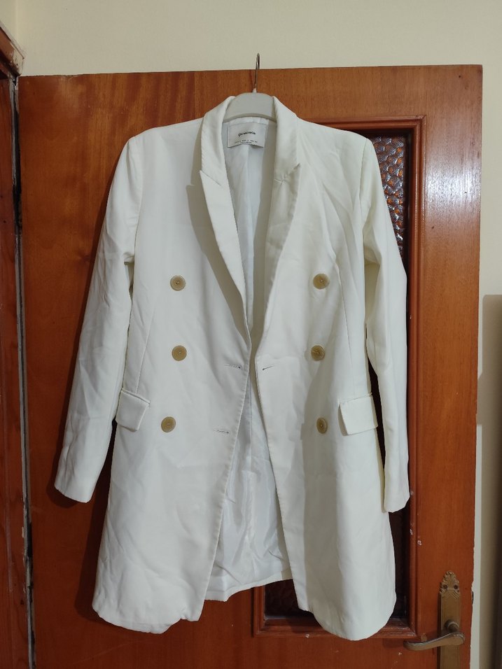 Düğmeli beyaz midi blazer, pamuk kumaştan, normal kesim ve uzun kollu. Ofis kullanımı için uygun, desen içermeyen şık tasarım.