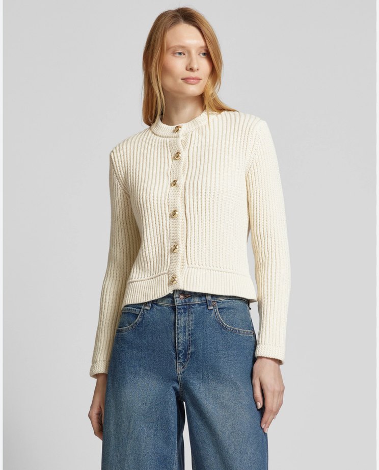 Düğmeli, beyaz renkli, bisiklet yaka ve uzun kollu denim midi hırka, normal kesim, günlük kullanım için uygundur.