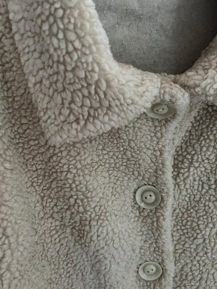 Düğmeli ve kırık beyaz renkte, yumuşak ve sıcak dokulu kumaştan midi boy kadın kaban. Geniş kesim ve uzun kolludur, günlük kullanıma uygundur.