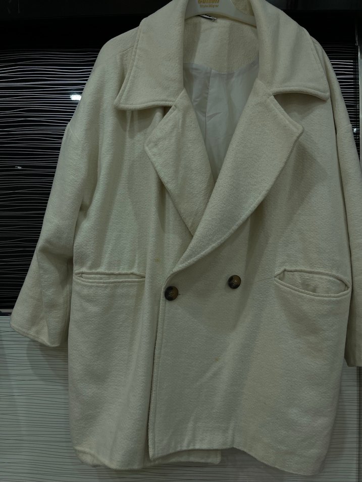 Düğmeli, keten kumaştan yapılmış beyaz renkli, uzun kollu, midi boy, bol kesim kadın kaban.