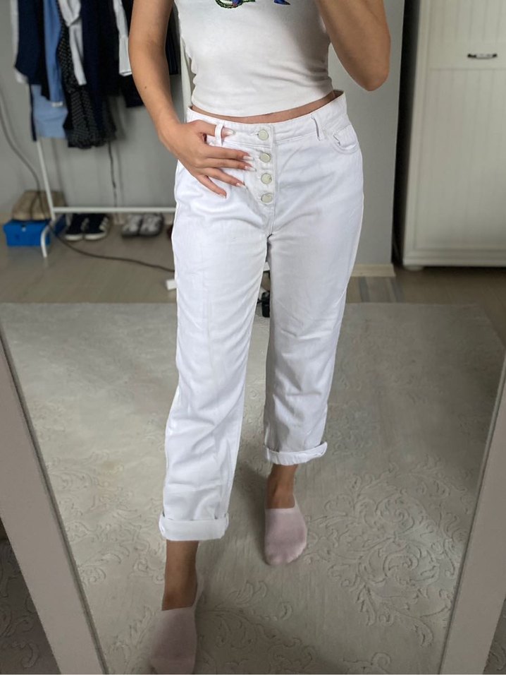 Düğmeli ön kısmı ve rahat pamuklu kumaşıyla beyaz midi kot pantolon, bol kesim ve günlük sokak stili için uygun. Görsellerde de belirttim esneme payı vardır. Paçalarını ben kendim kıvırdım normalde daha uzun ve dar paça. Bel: 69, İç Bacak: 53, Basen: 96, Boy: 163, Kilo: 53