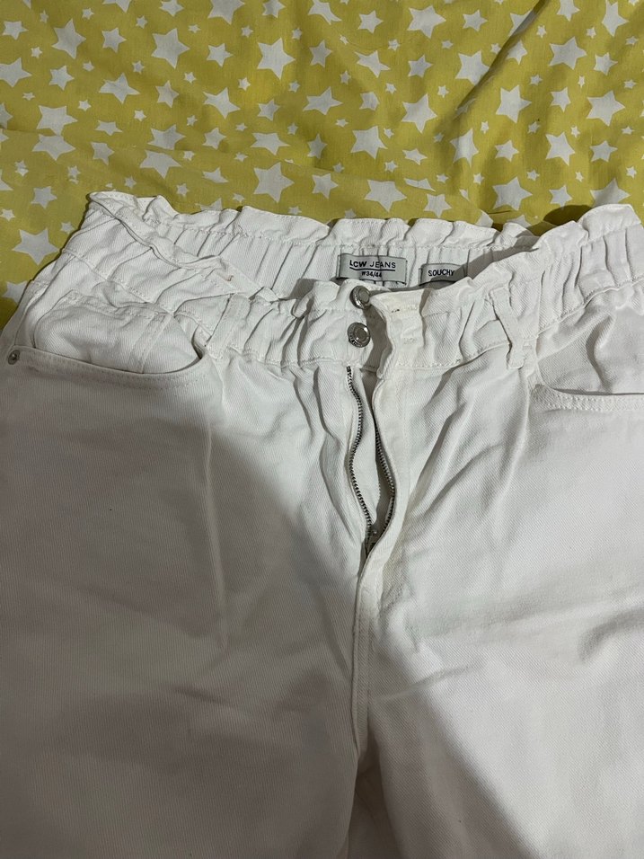 Pamuklu, düğmeli ve bol kesim beyaz midi kot pantolon, günlük rahat kullanım için uygundur.