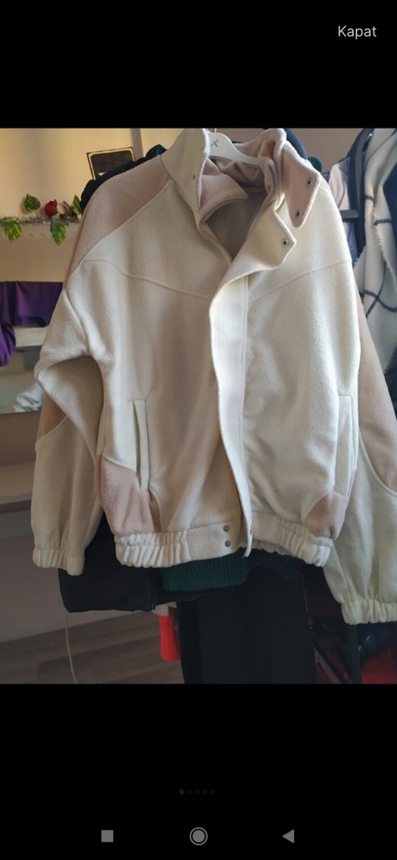 Düğmeli, yüksek yakalı krem kadın ceket, bol kesim ve midi boydadır. Uzun kollu ve yumuşak, sıcak kumaştan günlük kullanım için uygundur.
