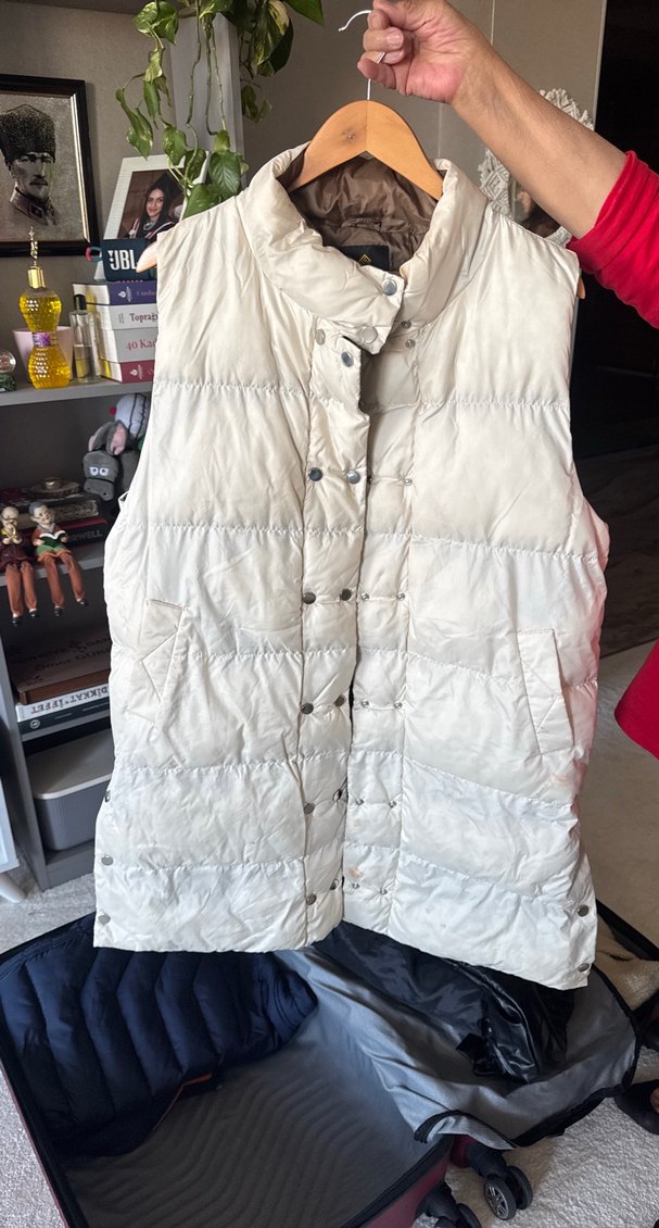 Düğmeli, yüksek yakalı beyaz kadın yelek. Midi boy, fitted kesim ve sentetik kumaştan, gündelik dış mekan kullanımı için uygundur.