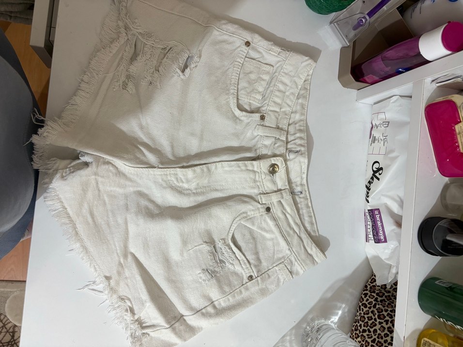 Düğmeli ön kısmı ve bol kesimi olan beyaz mini denim şort. Keten kumaştan yapılmış, gündelik sokak stili için uygun. Desensiz, günlük kullanım için ideal.