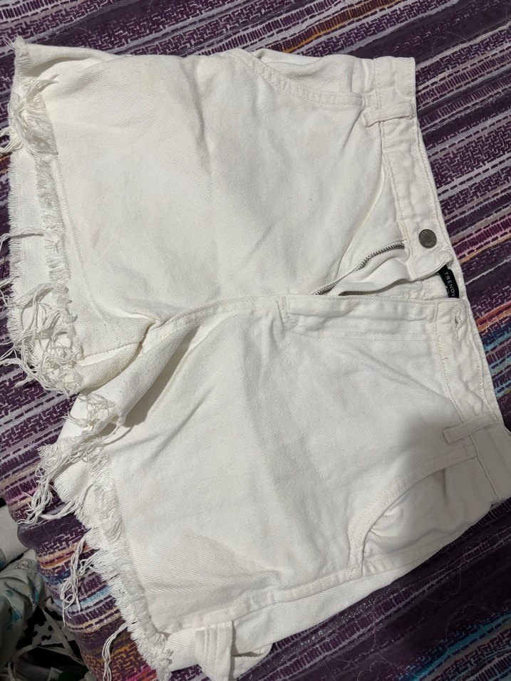 Pamuklu beyaz mini denim şort, düğmeli ve bol kesim. Püsküllü kenarlarıyla günlük sokak stiline uygun.