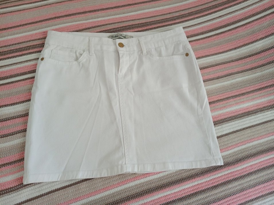 Beyaz renkli, düğmeli ve pamuklu kumaştan yapılmış, bol kesim mini etek. Günlük kullanım için uygun, rahat sokak stili etek.