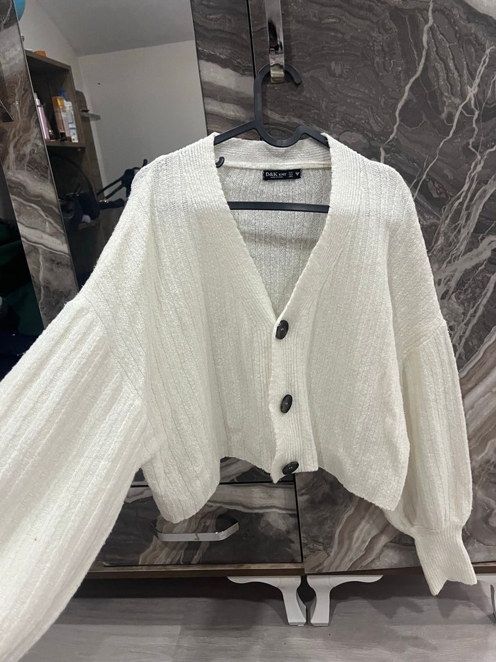 Düğmeli, uzun kollu ve V yakalı beyaz mini hırka, pamuklu yumuşak dokusuyla rahat ve salaş bir görünüme sahiptir. Günlük sokak stiline uygundur.