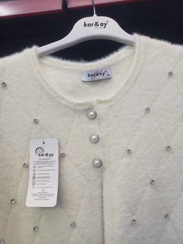 Uzun kollu, yuvarlak yaka ve kısa boydadır. Düğmeli ve küçük baskılı detaylara sahip, yumuşak ve sıcak dokuda beyaz kadın kazak.