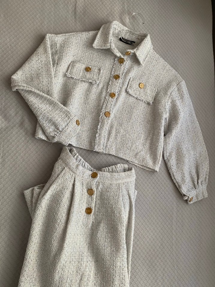 Düğmeli, uzun kollu ve kesik yakalı beyaz kadın takım. Yumuşak keten kumaştan, rahat kesimli ve sokak stiline uygun. Etek 85 cm 40 beden 160boy 57 kg ile giyildi