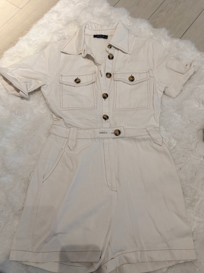 Düğmeli Beyaz Kadın Mini Tulum