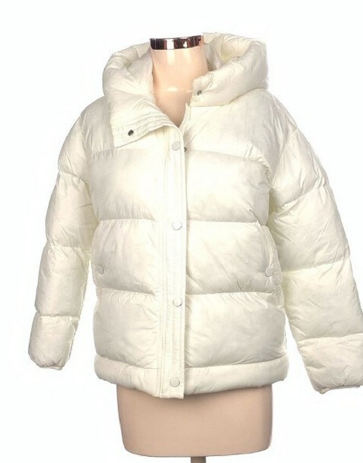 Düğmeli ön ve kesik yaka detaylı beyaz kadın mont. Uzun kollu, vücuda oturan kesimiyle yumuşak ve sıcak kumaştan üretilmiştir. Günlük kullanım için uygundur.