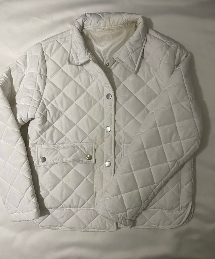 Düğmeli, beyaz renkli, kapitone desenli kadın monttur. Kırlangıç yaka, uzun kollu ve orta boy kesime sahiptir. Yumuşak sentetik kumaştan üretilmiş, günlük kullanıma uygundur. Cep detayları düğmelidir.