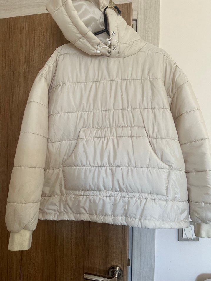 Düğmeli, yüksek yakalı beyaz kadın mont, sokak stilinde. Normal midi boyda, uzun kollu ve yumuşak sentetik kumaştan, günlük kullanıma uygun. ❄️