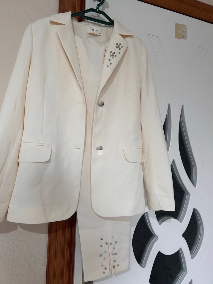 Düğmeli Beyaz Kadın Ofis Takımı