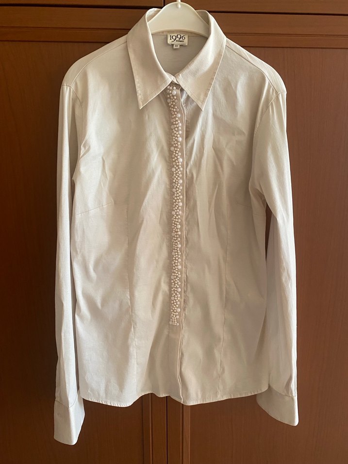 Uzun kollu, beyaz pamuk gömlek, yakalı ve düğmeli, parlak görünümlü, normal kesim, ofis için uygundur.