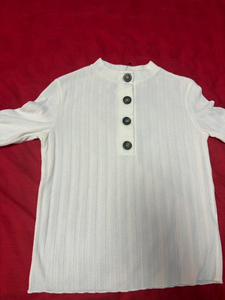 Beyaz pamuk kumaştan,düğmeli plaketli yuvarlak yakalı, normal boyda. Rahat günlük LTB “M”beden