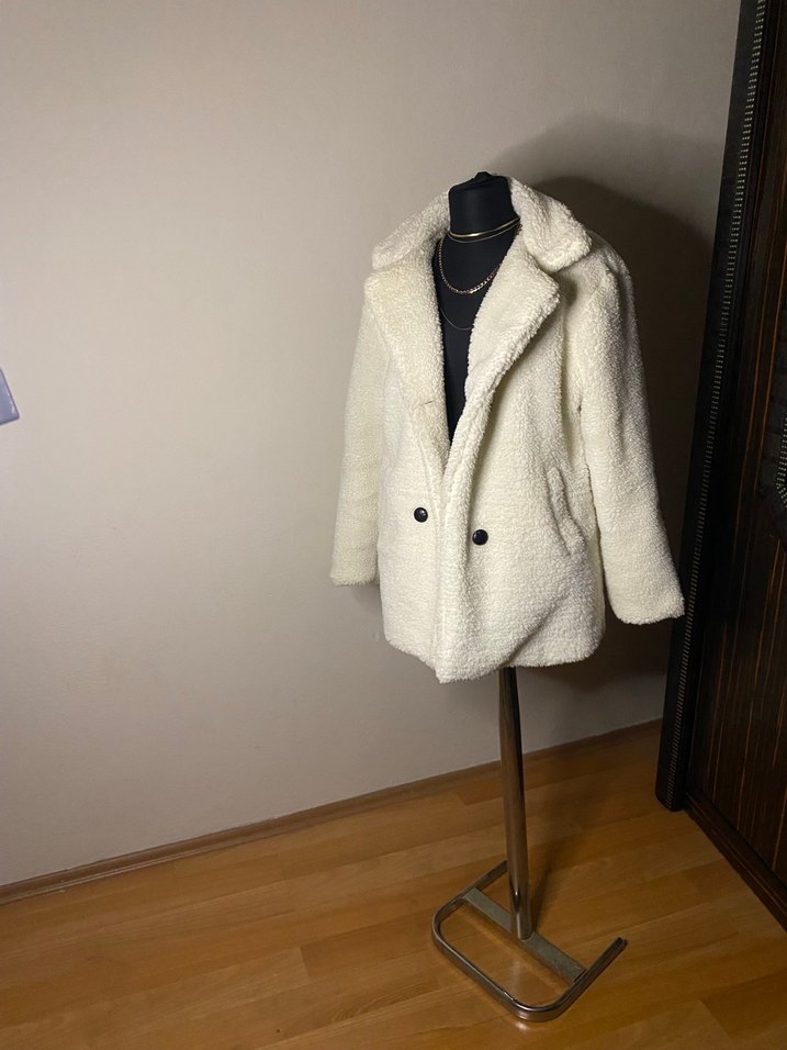Uzun kollu, düğmeli ve kruvaze yaka detaylı beyaz kadın kaban. Yumuşak ve sıcak dokulu kumaştan, rahat kesimle sokak stiline uygun. ❄️