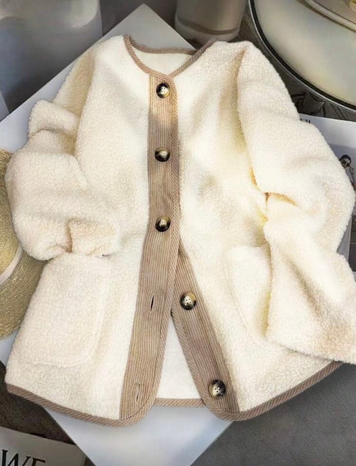 Kadınlar için düğmeli, uzun kollu, notched lapel yakalı, yumuşak peluş kumaştan yapılmış beyaz, normal midi boyda, bol kesim ceket.