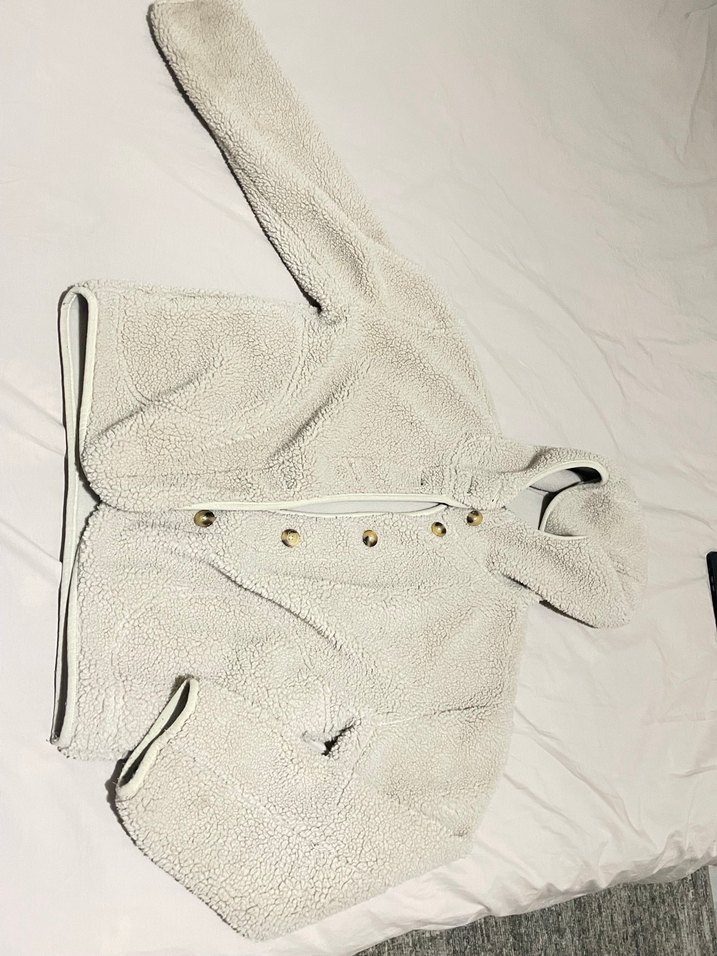 Düğmeli, beyaz kadın polar ceket, yumuşak ve sıcak kumaştan yapılmıştır. Notlu yaka ve uzun kolludur, midi boyu günlük kullanıma uygundur. ❄️