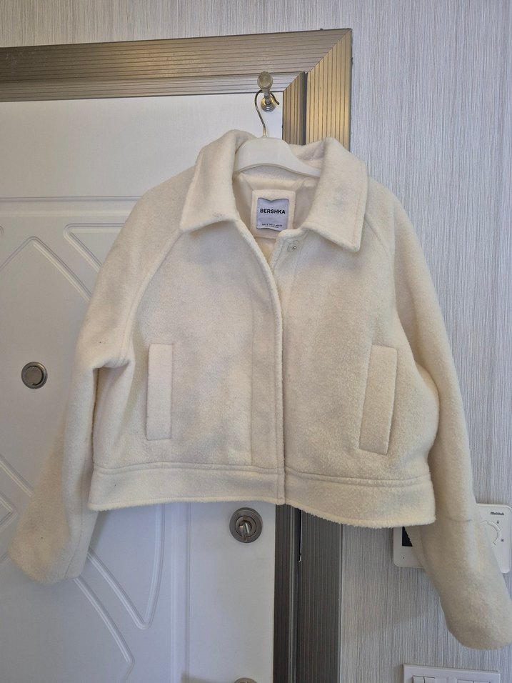 Düğmeli, beyaz renkte, uzun kollu, notched lapel yakalı, bol kesim kadın polar cekettir. Yumuşak ve sıcak kumaştan yapılmıştır, günlük kullanım için uygundur.