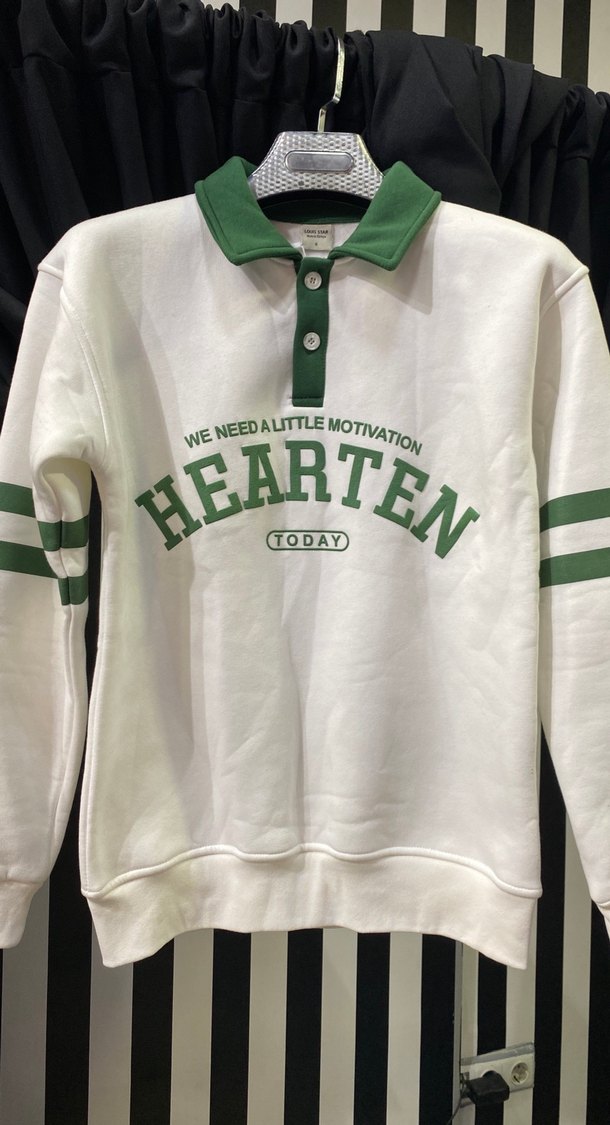 Beyaz pamuklu kumaştan, uzun kollu, düğmeli yeşil yakalı, bol kesim kadın sweatshirt. Kol ve göğüste baskılı detaylar ve yeşil çizgiler bulunur. Rahat ve günlük kullanım için uygundur.