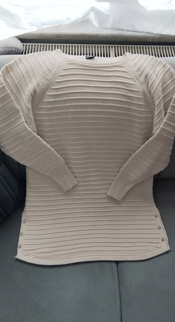 Düğmeli beyaz kadın triko, bisiklet yaka ve uzun kolludur. Dokulu, fitilli tasarımı ve yumuşak sentetik kumaşıyla günlük kullanıma uygundur.