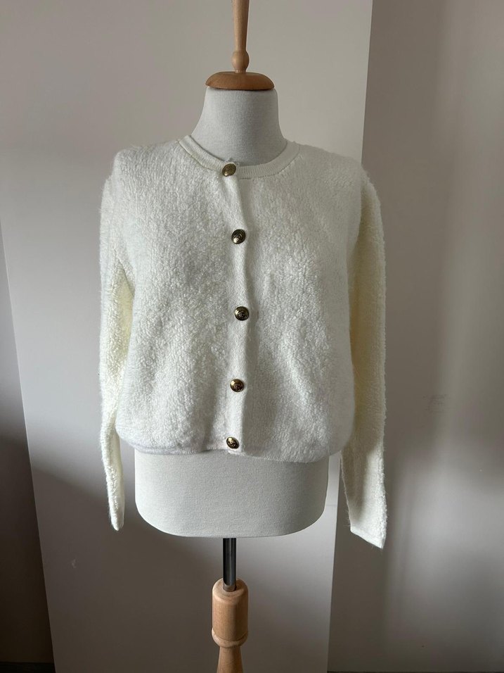 Bu beyaz triko hırka, yuvarlak yakalı ve uzun kolludur. Düğmeli ön kısmı ve bol kesimiyle rahat ve bohem bir tarza sahiptir.