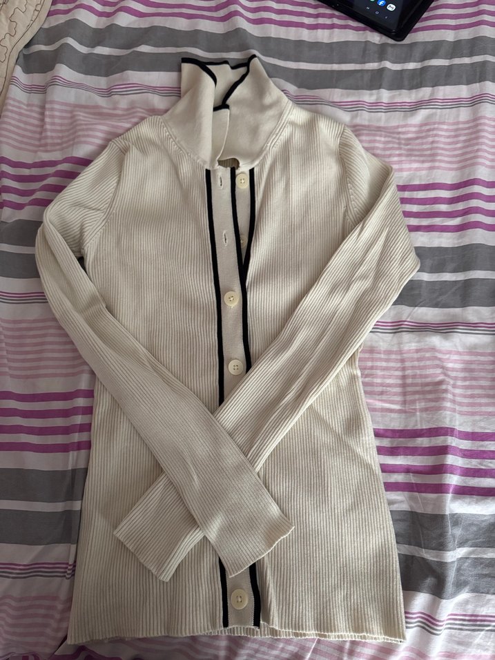 Düğmeli, yakalı beyaz triko kazak, uzun ve vücuda oturan kollara sahip. Normal midi boyunda, gündelik kullanıma uygun sade bir tasarım.