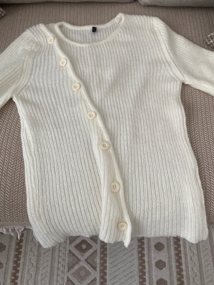 Düğmeli ve uzun kollu beyaz triko kazak, bisiklet yaka ve vücuda oturan normal boyda tasarıma sahiptir. Günlük kullanıma uygundur.