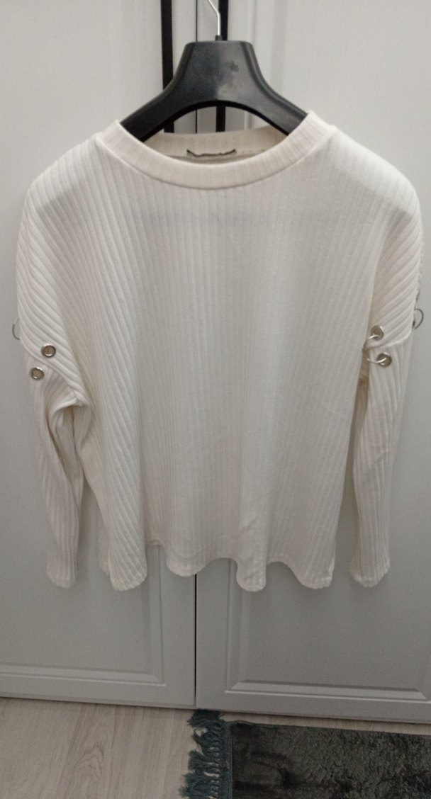 Uzun kollu, düğmeli detaylı beyaz triko kazak. Yuvarlak yaka ve rahat kesimiyle günlük kullanıma uygun, desen içermeyen rahat bir model.