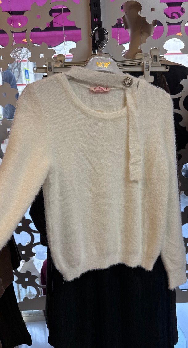 Düğmeli, yuvarlak yaka beyaz triko kazak, uzun kollu ve bol kesimdir. Normal boyda ve gündelik rahat sokak stiline uygundur.