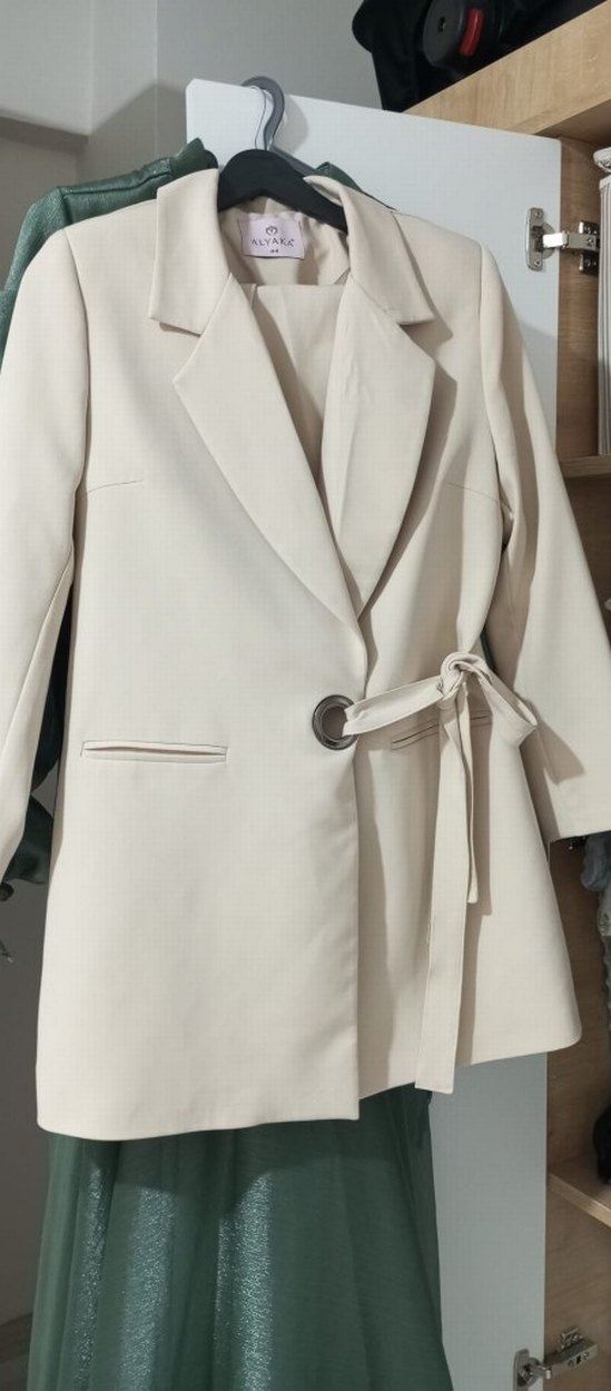 Düğmeli ve strappy kollu beyaz kadın blazer ceket, uzun boyda ve regular fit. Ofis ve sokak stiline uygun, klasik şıklık sunar.