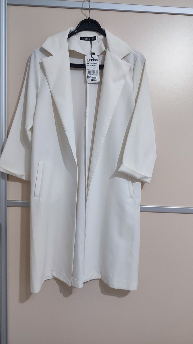 Düğmeli, kesik yaka ve uzun kollu beyaz kadın ceket. Sentetik kumaştan, ofis veya günlük iş stiline uygun, rahat kesim.